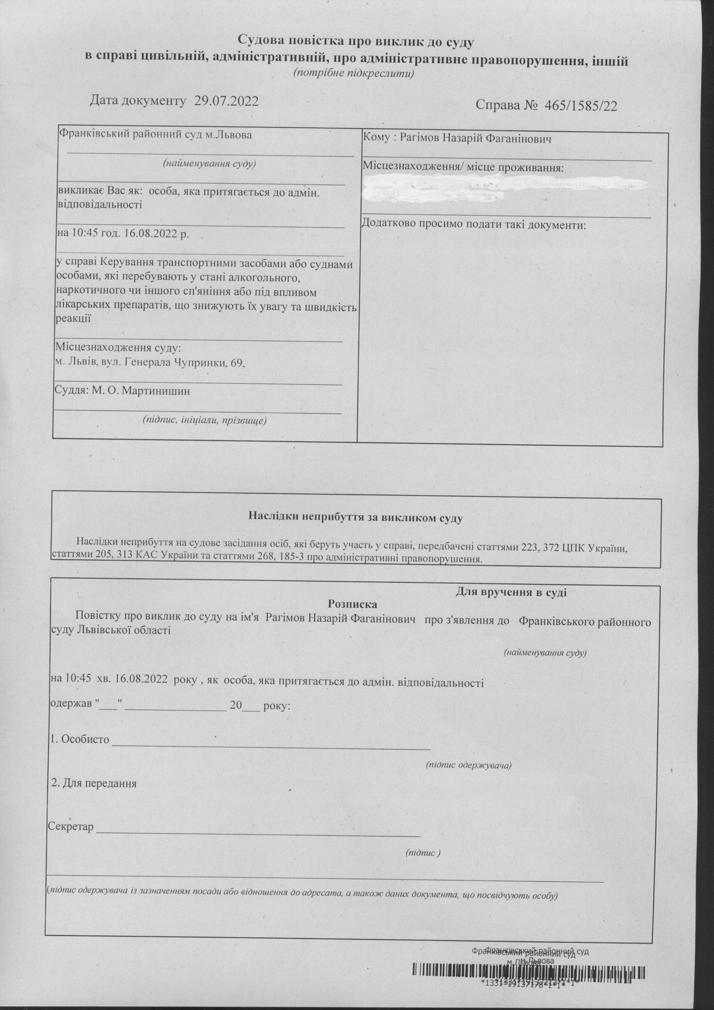 Повідомлення про виклик до суду по справі 465/1585/22