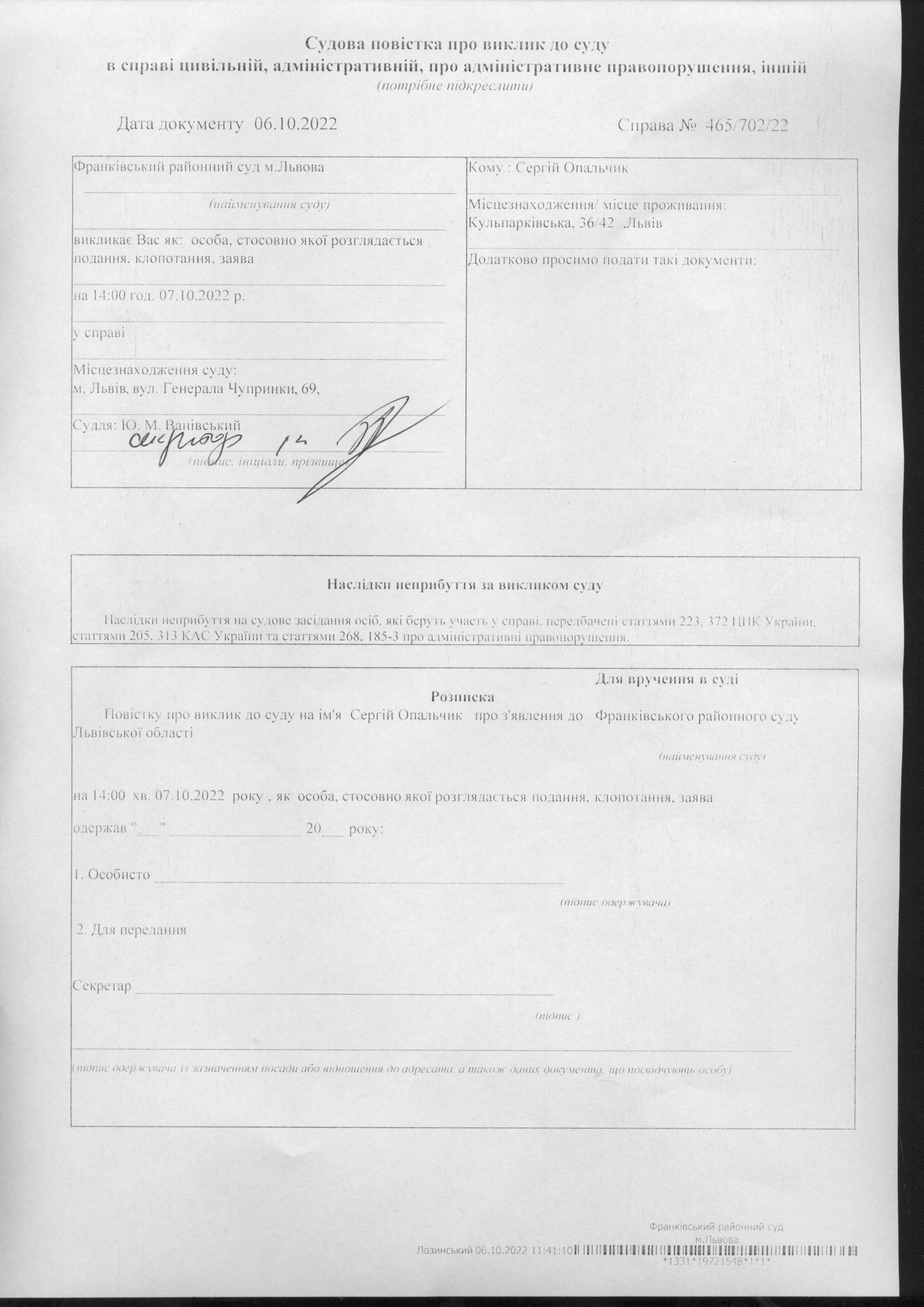 Повідомлення про виклик до суду по справі 465/702/22